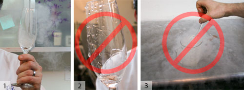 防寒眼鏡。1)使用干燥的玻璃杯。將液氮倒入玻璃杯中,旋轉幾秒鐘。將多余的東西倒入下一個玻璃杯中(有效)或將其扔在地板上(有趣)。我從來沒有這樣打破過玻璃,我已經冷凍了成千上萬。2)切勿使用濕玻璃杯。3)尤其不要將濕玻璃浸入液氮中。破損的可能性很大。浸入玻璃杯也會使外部溫度過高,這可能會傷害飲酒者的嘴唇。