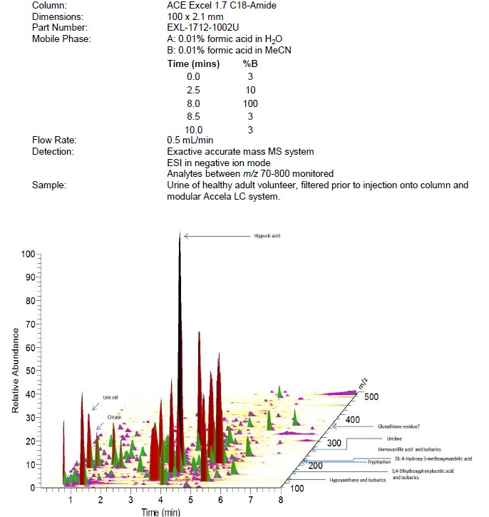 此為在C18中嵌入酰胺基團的特色固定相,可以利用酰胺鍵增強大極性化合物的保留,比如: