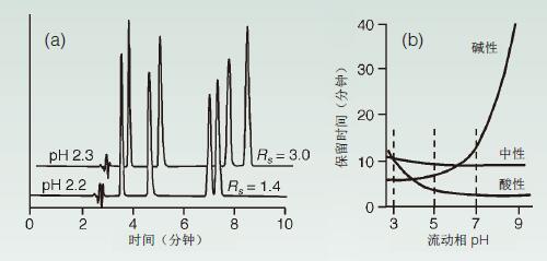 pH為3時,其保留情況比pH為5時更加敏感(對于酸性),而對于堿性,則pH需要大于等于6。而且,當(dāng)pH接近pKa時,保留時間將不穩(wěn)定;如果存在類似結(jié)構(gòu)的化合物,相應(yīng)的峰值間距(選擇性)會發(fā)生改變。