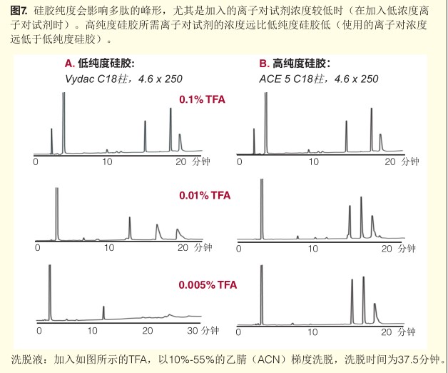 三氟乙酸:使用最廣泛,在分析得到的峰形相似的情況下,硅膠純度越高,使用的離子對試劑濃度可以相對更低。