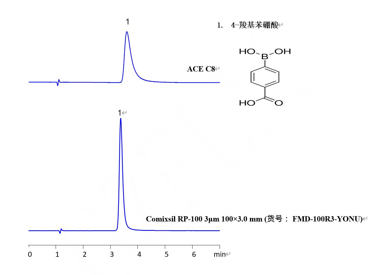 備注: 4-羧基苯硼酸可以在混合作用的 Comixsil RP-100 上獲得比常規(guī)反相柱(如 ACE C8) 更好的峰形。