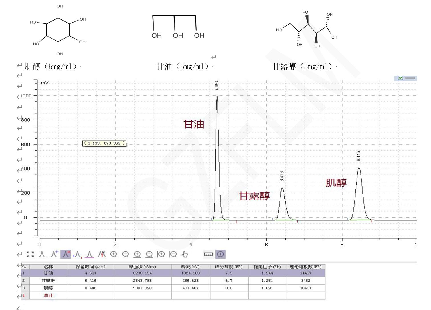 案例說明:Comixsil HCS 利用陽離子交換+HILIC 的混合模式,可以利用醇類化合物之間親水性不同達到分離效果,可以通過調節(jié)有機相的比例和緩沖鹽的濃度調節(jié)保留時間。