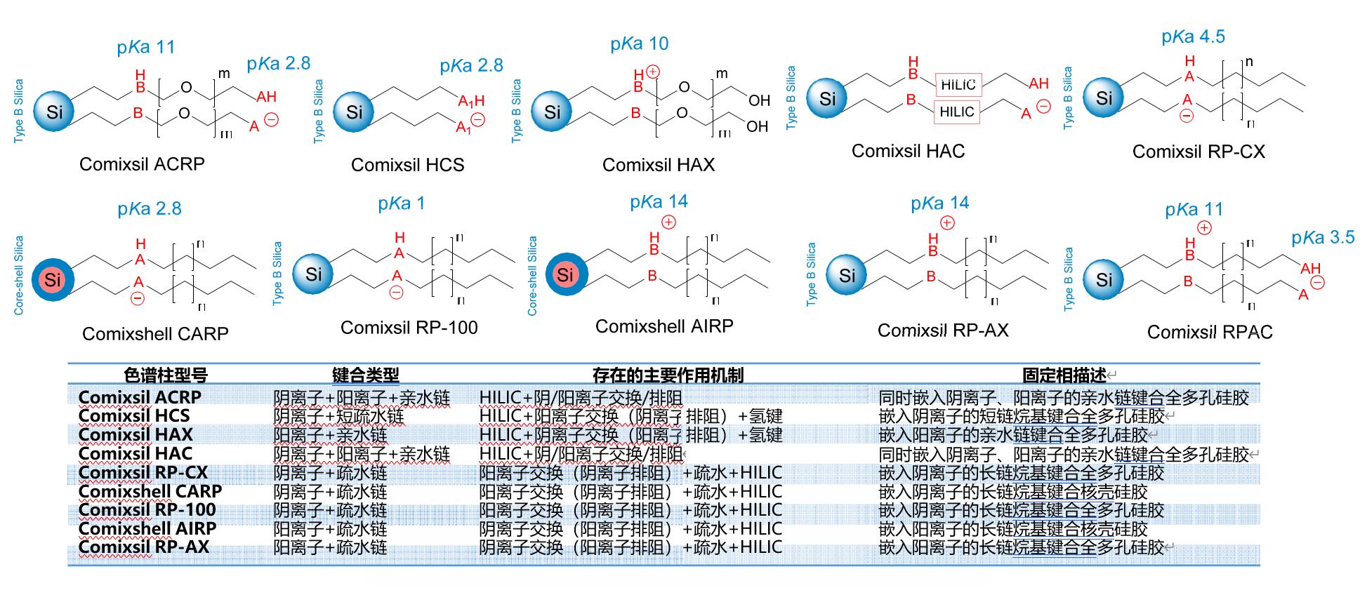 菲羅門公司的Comix系列為創(chuàng)新的混合作用(Mixed-mode)液相色譜柱,通過在疏水的碳鏈或者親水鏈上嵌入離子基團(tuán),可以實現(xiàn)在不同的流動相條件下提供離子交換/排阻、Hilic和疏水等作用,可以為大極性化合物和成分之間性質(zhì)差異大的樣品的分析提供新的解決方案。以下為具體固定相信息: