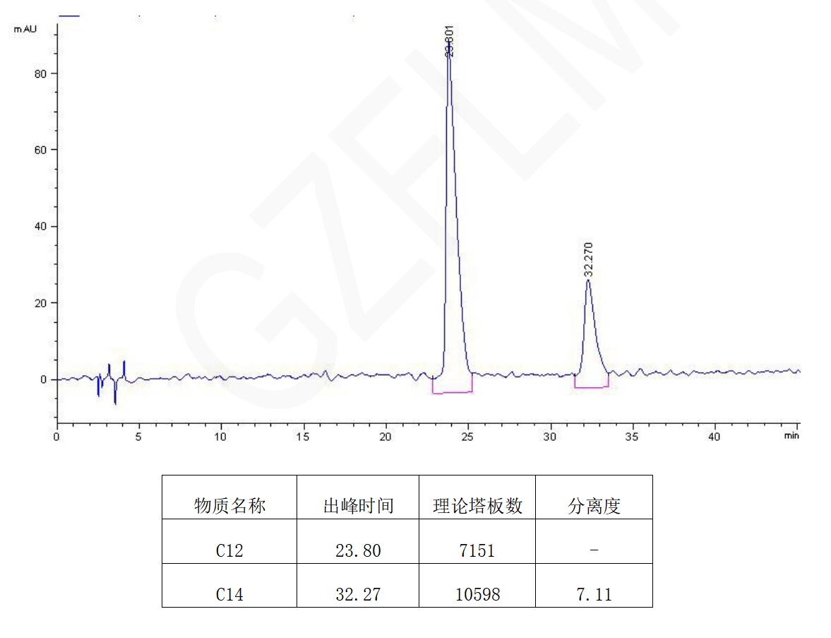 方法:參照中國藥典2010(要求苯扎氯銨C12與C14峰分離度大于6.0)