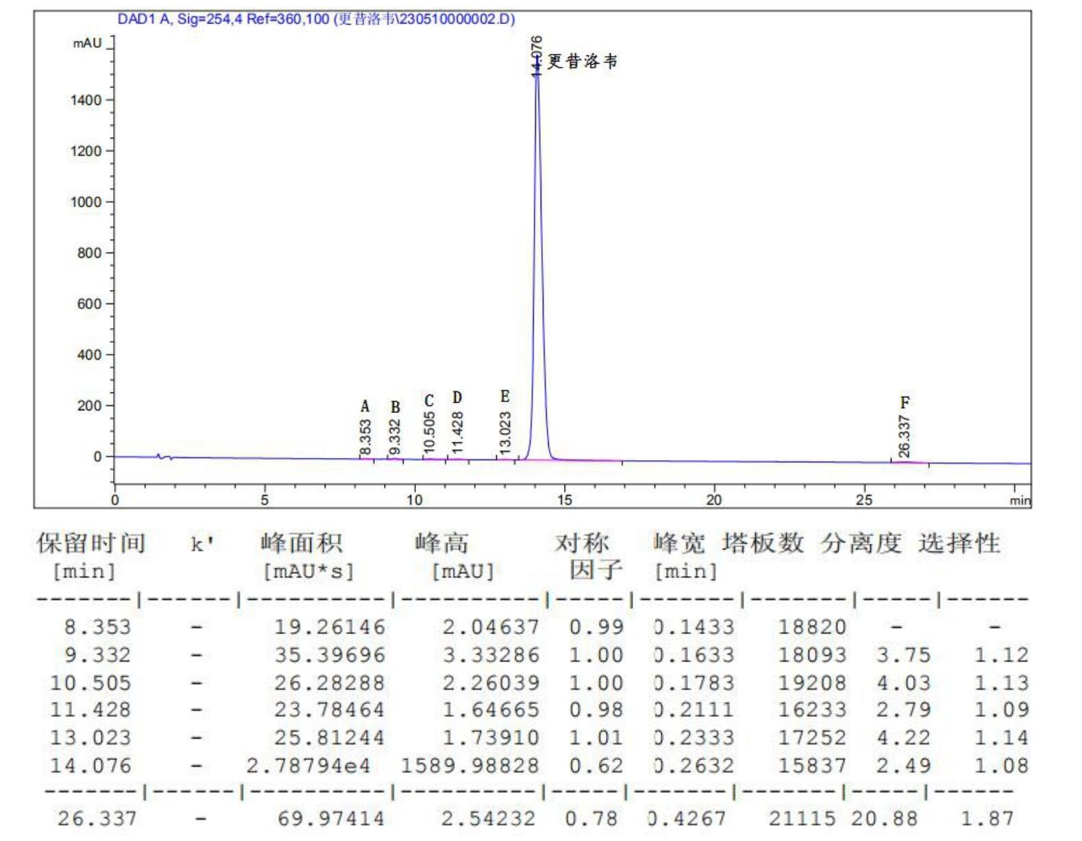 方法說明:依據(jù) EP 標(biāo)準(zhǔn)中檢測更昔洛韋及有關(guān)物質(zhì)方法,使用強(qiáng)陽離子交換色譜柱 SuperLu SCX 進(jìn)行,更昔洛韋及雜質(zhì) A、B、C、D、E、F 就能有效分離,符合要求;對(duì)于強(qiáng)陽離子交換柱而言,保留強(qiáng)的化合物在緩沖鹽體系下會(huì)洗脫更完全,建議每日使用后用 200mM 磷酸二氫銨(pH3.5)沖洗半個(gè)小時(shí),該步驟可較好的維護(hù)色譜柱,長時(shí)間在乙腈-0.05%TFA 下,對(duì)柱子有所損傷的,盡量不要保存過夜。