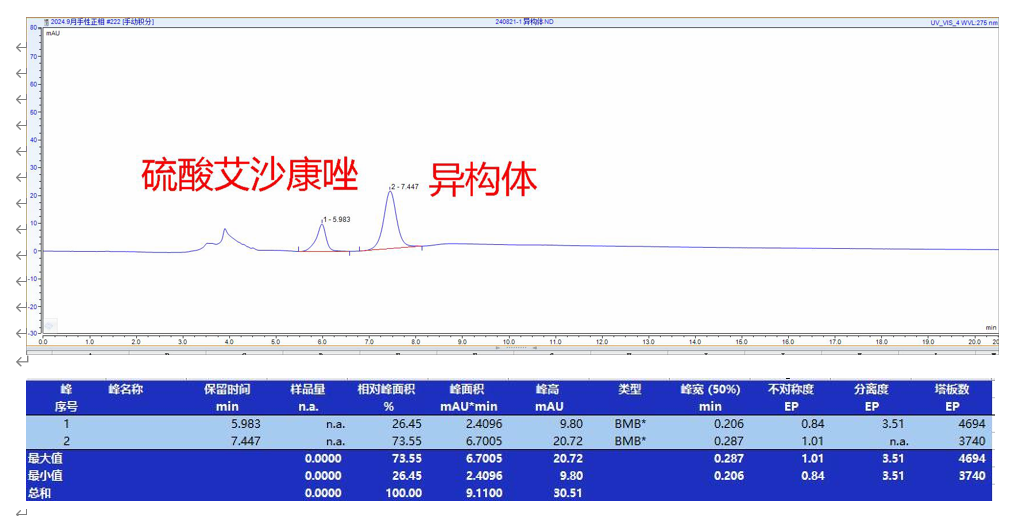 硫酸艾沙康唑及其對映異構(gòu)體的手性拆分 色譜柱:Chiral ND(2) 5u 250*4.6mm (P/N: FMG-AC5-A01-NFC) 流動(dòng)相:正相(咨詢) 柱溫:25℃ 流速:0.8 mL/min 檢測波長:275nm 濃度:N/A 溶劑:30%乙腈 色譜圖: