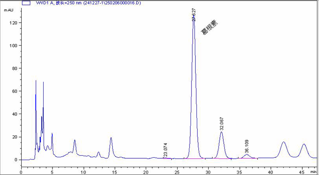 App ID: FLM-S250001 SuperLu C18 柱對葛根的含量測定 方法:中國藥典一部 色譜柱:Superlu C18 5μ 250*4.6mm (貨號:FMG-5252-EONU) 流速:1 mL/min 樣品濃度:1 mg/mL 進(jìn)樣量:10μ 檢測:250nm 流動相:甲醇:水=25:75 色譜圖: