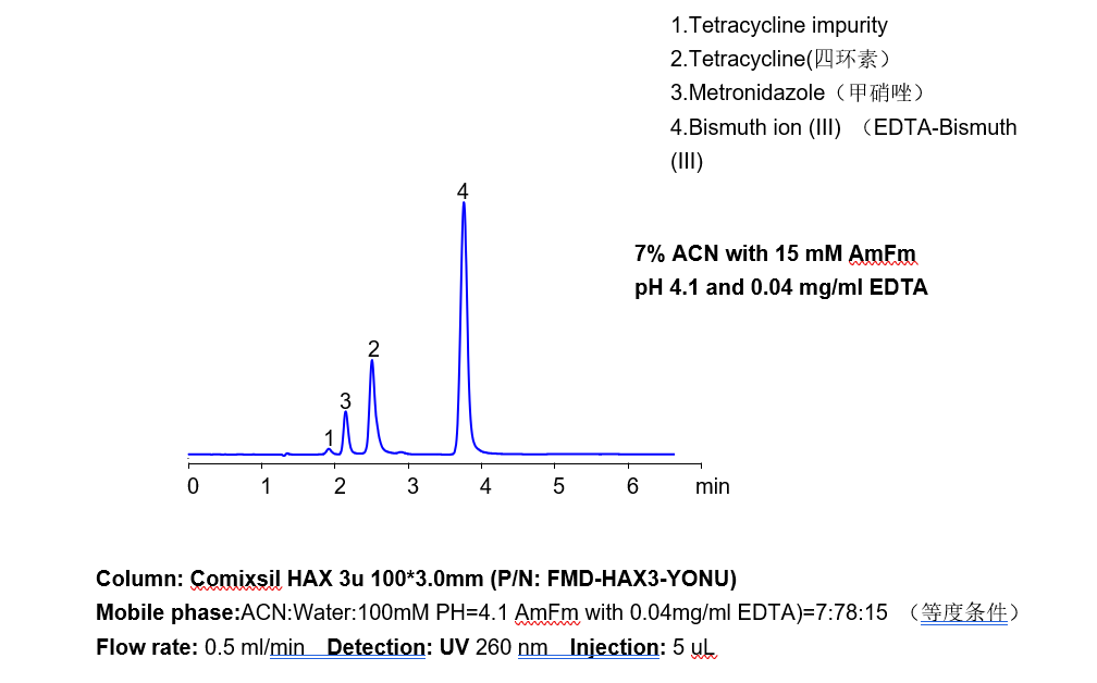 說明:在以上“方法A”中,絡(luò)合三價鐵離子的過程是在鐵離子接觸到流動相時瞬時進行的,從而絡(luò)合物在HAX色譜柱上保留,并通過UV可視從而檢測。在“方法B”中,案例的實際樣品是硫酸亞鐵,但是亞鐵的二價離子,在固體鹽溶解時,水中電離出的游離亞鐵離子,即氧化成三價鐵離子,實際檢測到的也是三價鐵離子的EDTA絡(luò)合物,而這個與“方法A”不同的地方在于,客戶不喜歡流動相中加EDTA,所以是在樣品配置過程中,加入了EDTA,使樣品在進樣前已經(jīng)絡(luò)合完畢?!胺椒ˋ"中是梯度條件,”方法B“中是等度條件。單純的檢測,都可以用等度的方法進行,更方便。 兩種方法都可以用于單獨檢測三價鐵離子或者二價鐵離子。在此,需認識到,二價鐵離子無法與三價鐵離子分離的,因為二價鐵離子實際就是氧化后的三價鐵離子。所以,關(guān)于能否分離二價與三價鐵離子的問題討論,在這個方法中,是不存在的。 應(yīng)用二:三價鉍離子的檢測 在前文三價鐵離子的基礎(chǔ)上。我們開發(fā)出三價金屬離子HPLC-UV檢測辦法。實際應(yīng)用中,遇到了三價鉍離子的殘留檢測的問題。按照同樣的思路,以下案例以EDTA與三價鉍離子絡(luò)合物狀態(tài),一樣得以相似方法檢測。