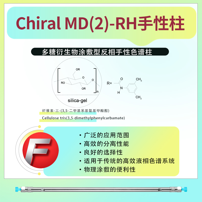 Chiral MD(2)-RH反相手性柱適用于分析水溶性樣品或?qū)H值有特定要求的樣品,尤其在液相色譜-質(zhì)譜聯(lián)用(LC/MS)分析中表現(xiàn)出色。其固定相為纖維素-三-(3,5-二甲基苯基氨基甲酸酯),這種固定相的選擇性使得該色譜柱能夠有效地分離對(duì)映異構(gòu)體。