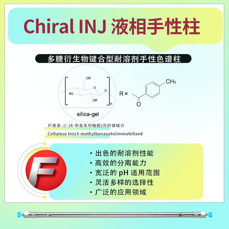 Chiral INJ 鍵合型耐溶劑手性柱 一、固定相與特性 Chiral INJ 鍵合型耐溶劑手性柱的固定相為纖維素-三-(4-甲基苯甲酸酯)共價(jià)鍵鍵合(Cellulose tris(4-methylbenzoate)immobilized)。這種設(shè)計(jì)使得該手性柱具有出色的手性識(shí)別能力和耐溶劑性,能夠在廣泛的溶解條件下使用,包括各種互溶的溶劑作為流動(dòng)相、溶解樣品以及手性柱再生。 二、使用條件 壓力:為了延長(zhǎng)手性柱的使用壽命,建議保持壓力在30MPa以下。這有助于減少色譜柱的磨損和性能下降。 pH值:該手性柱適用于pH值范圍在2.0至9.0之間的溶液。這提供了廣泛的適用性,適用于多種實(shí)驗(yàn)條件。 溫度:建議在0℃至40℃的溫度范圍內(nèi)使用,以確保色譜柱的穩(wěn)定性和分離效果。 三、可使用的溶劑 Chiral INJ 鍵合型耐溶劑手性柱可使用多種溶劑,包括: 正相溶劑:如n-Hexane(正己烷)、IPA(異丙醇)、EtOH(乙醇)等。 特殊流動(dòng)相:如Ethyl acetate(乙酸乙酯)、CH3Cl(氯仿)、THF(四氫呋喃)、MTBE(甲基叔丁基醚)等。 反相溶劑:如H2O(水)、IPA(異丙醇)、MeOH(甲醇)等。 這種廣泛的溶劑適應(yīng)性使得該手性柱在實(shí)驗(yàn)和分析中具有更高的靈活性和適用范圍。 四、產(chǎn)品規(guī)格與訂貨信息 Chiral INJ 鍵合型耐溶劑手性柱具有多種規(guī)格,以滿(mǎn)足不同實(shí)驗(yàn)和分析需求。常見(jiàn)的規(guī)格包括不同粒徑(如5μm、3μm等)、不同長(zhǎng)度(如250mm、150mm等)和不同內(nèi)徑(如4.6mm、2.0mm等)的色譜柱。具體訂貨信息: