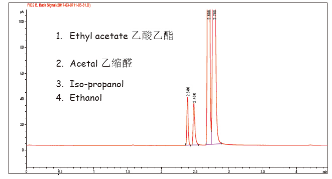 結(jié)論:白酒中一項主要考察指標(biāo),乙酸乙酯與乙縮醛在 FB-Wine 氣相柱上可以很容易在 50 ℃左右達(dá)到基線分離.
