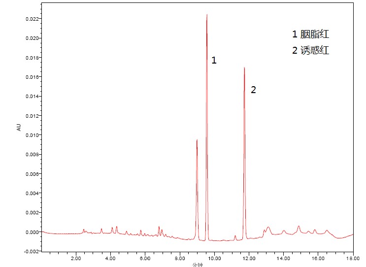 2、添加水平為 0.2 mg/kg 火腿中胭脂紅和誘惑紅檢測(cè)的液相色譜圖