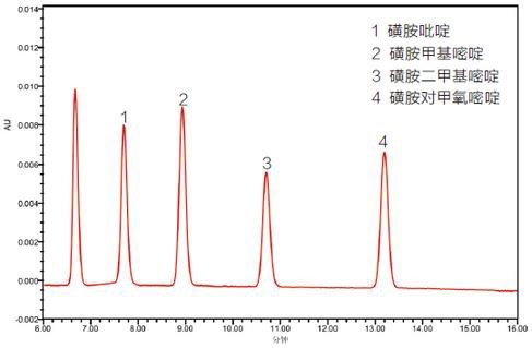 2、添加水平為0.2mg/kg豬肉基質(zhì)中磺胺檢測(cè)色譜圖