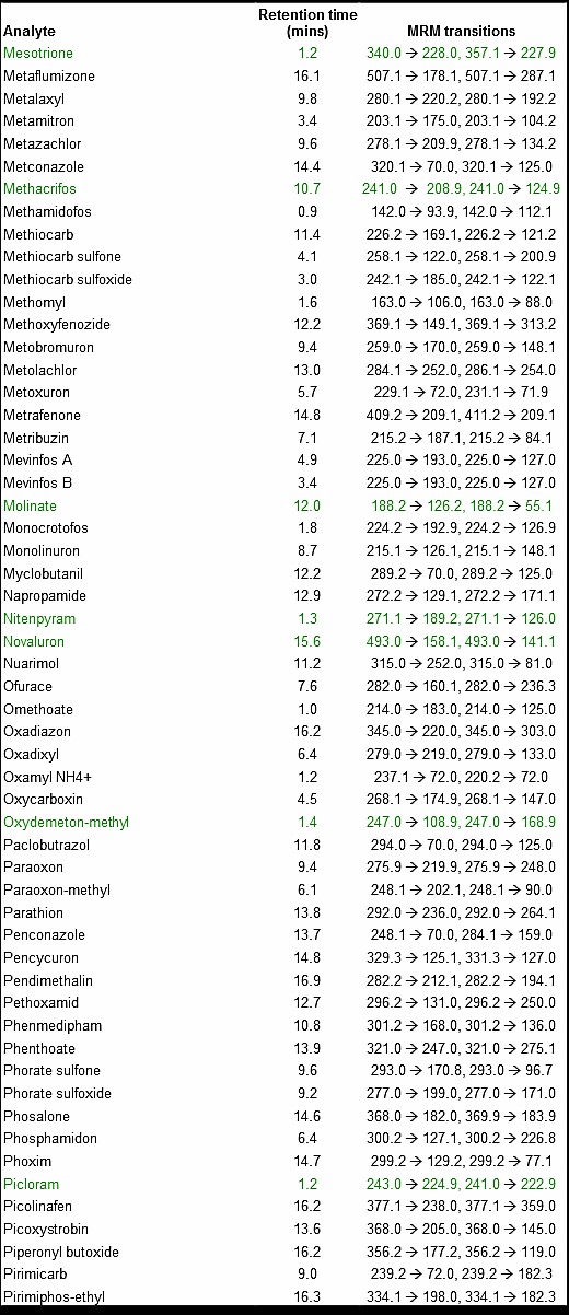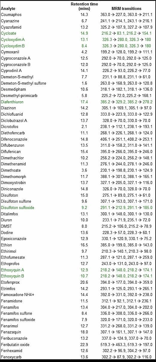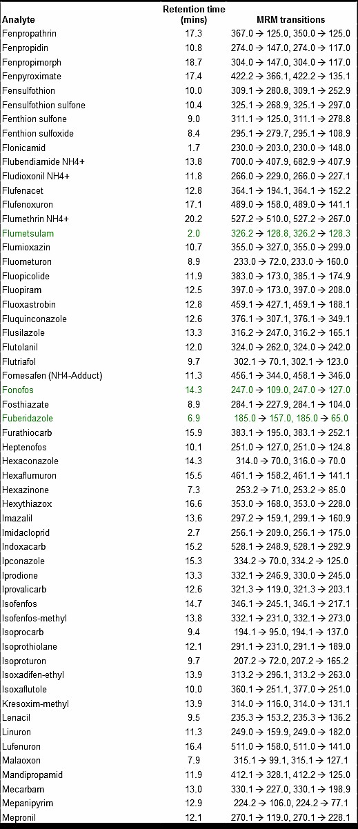 樣品:樣品制備采用QuEChERs方法,用黃瓜基質(zhì)加標(biāo)0.01mg/kg進行方法驗證。