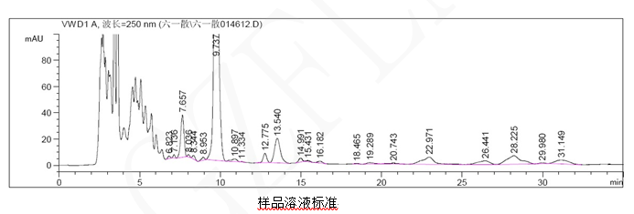 中國藥典規(guī)定理論塔板數(shù)按甘草酸銨應不低于3000,本試驗實際測出柱效為6143。