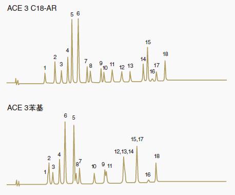 C18-AR可能具有其它不同的分離機制,可以為復雜的混合物帶來更好的分離效果。對于其他混合物,可能不是這種情況,這是ACE鍵合相的優(yōu)勢。