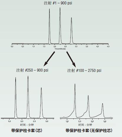 器更換后沒有解決系統(tǒng)壓力升高10%的問題,則說明應(yīng)該更換保護(hù)柱芯,也說明柱效或分辨率已經(jīng)降低了10%。)。圖13顯示了保護(hù)柱卡套(芯)在保護(hù)分析柱方面的有效性。