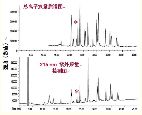 事實上,采用紫外檢測出現(xiàn)的小峰在質(zhì)譜圖中會更明顯(見圖26“*”)。