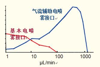 目前,商用電噴霧提供一種高剪切流氮氣輔助的電噴霧(氣流輔助電噴霧),它將電噴霧的最佳流速區(qū)間提升到了200~500μL/min。